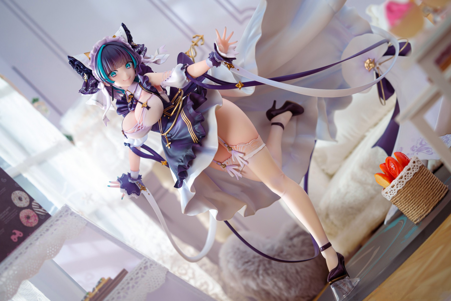 Lustrous metallic paints across armor parts and accessories contrast with soft fabric textures; layered frills and a headpiece evoking cat ears add character. Fine gradients on stockings, glossy accents, and crisp panel lines deliver depth and realism—one of Cheshire’s most “can’t-miss” displays.
