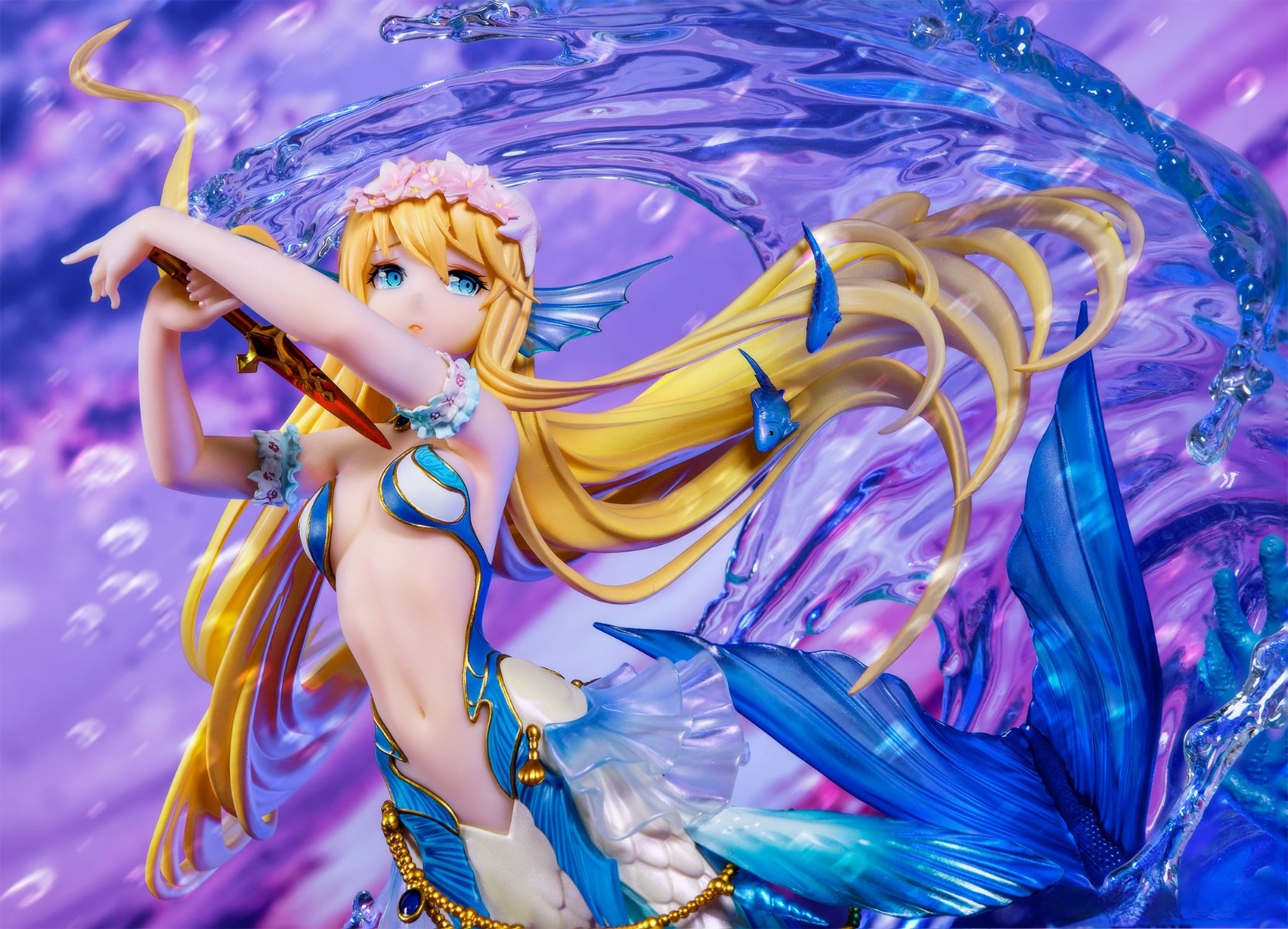 A flowing, water-shaped clear shell wraps the figure, both protecting it and completing a self-contained scene. Painted tropical fish, coral, and a seabed-style base deepen the ocean ambience, giving the piece a vivid, underwater mood.
