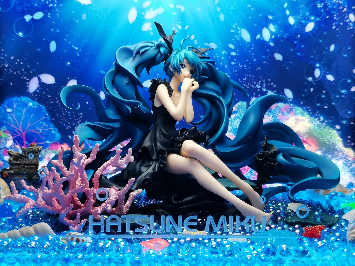 Based on the ethereal illustration by Haruyo, this figure captures Miku sitting gracefully at the ocean floor, her pale skin standing out against the flowing jet-black dress.